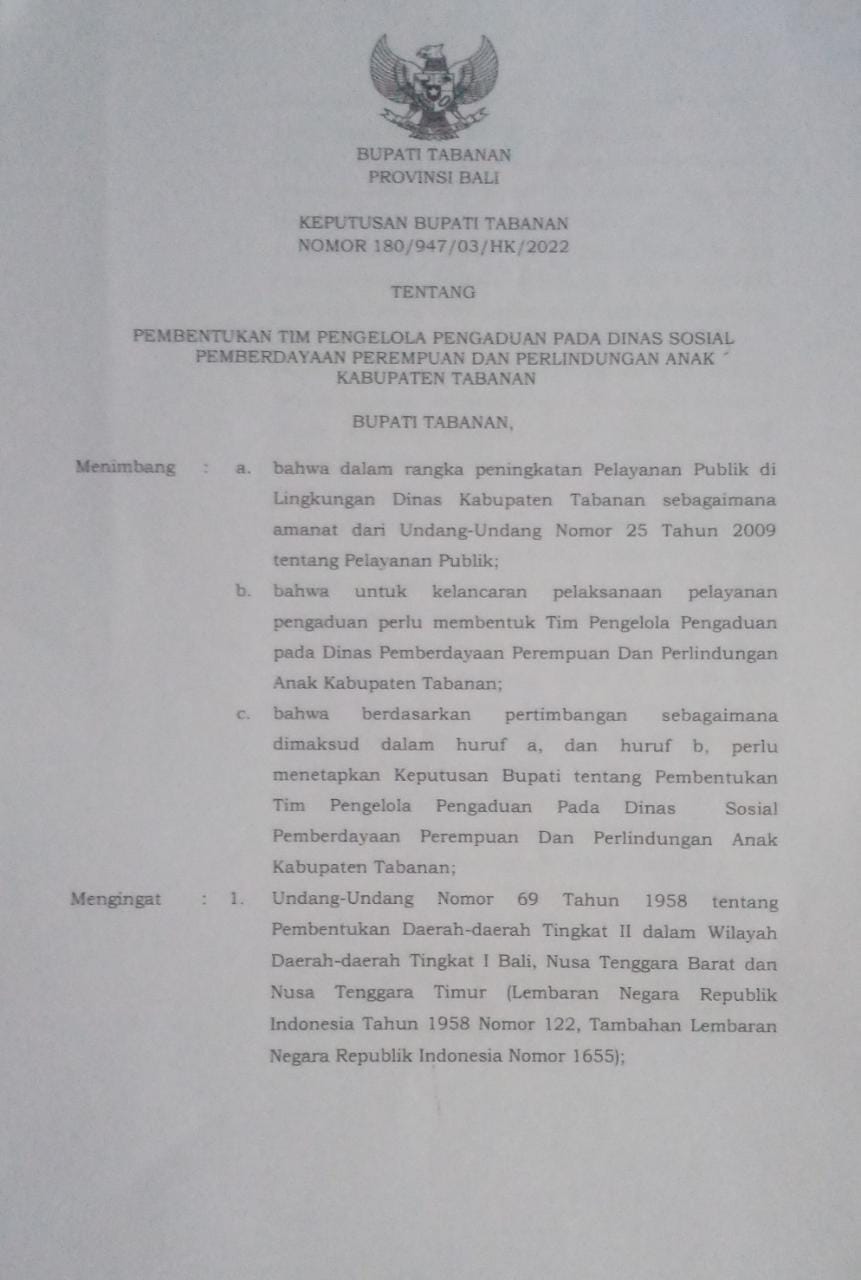 SK TIM PENGELOLA PENGADUAN PADA DINAS SOSIAL P3A, Selengkapnya Bisa Di Lihat Disini Navigasi pos Standar Pelayanan Penanganan Orang Indonesia dan Mayat Terlantar Monitoring Puskesmas Ramah Anak ,Penebel 2, Kab. Tabanan